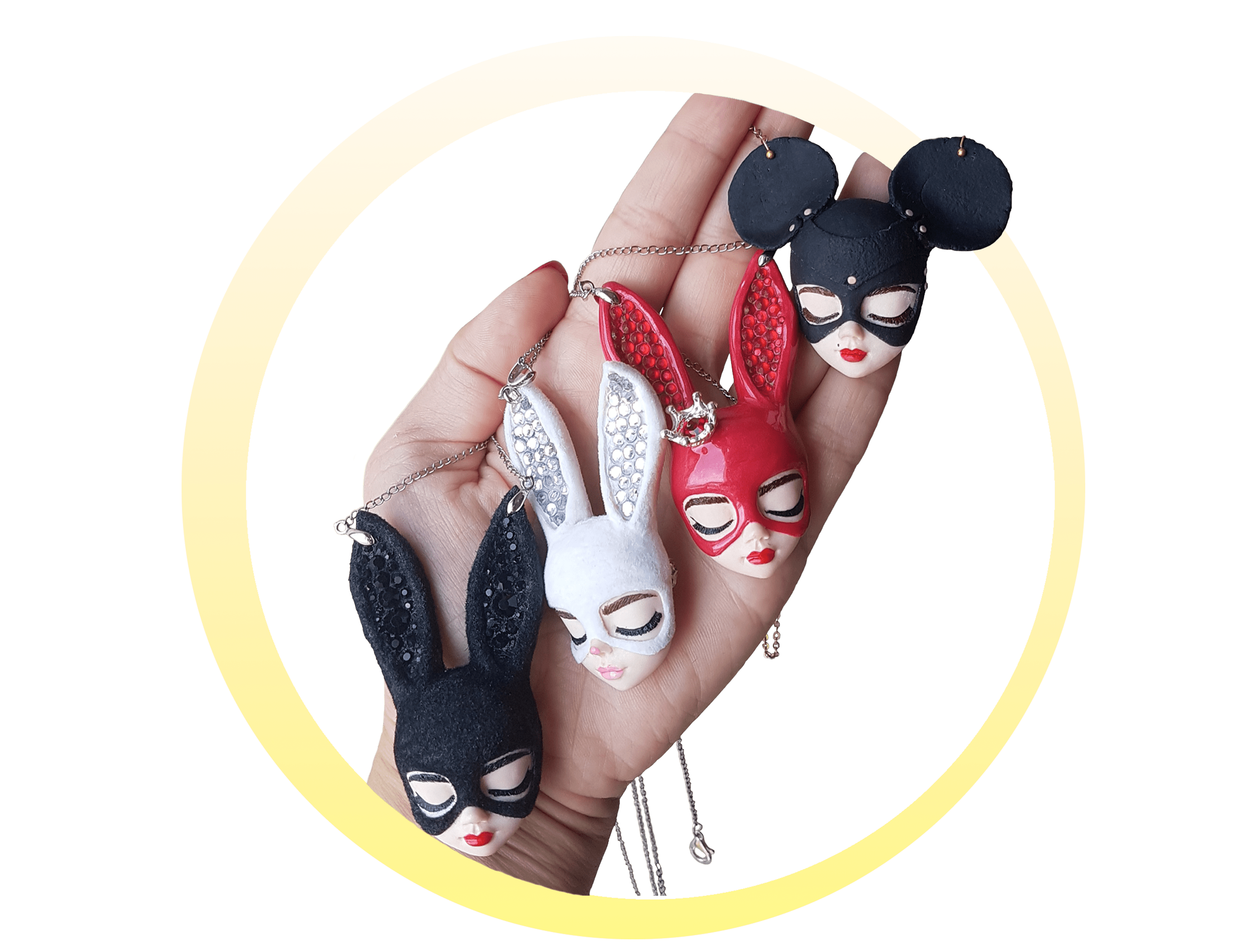 6 дизайнов ушастых красоток Которые могут быть выполнены в качестве кулонов/брошей (на ваш выбор) или декора кружки. Вы сможете слепить любой декор имея только базовое личико.Но если захотите облегчить себе работу и многократно ускорить создание этих прекрасных работ вы можете заказать молды личика в маске зайки с открытыми или закрытыми глазами. На мастер классе научитесь создавать маски лис, мышек, кошек и конечно заек с имитацией кожи, латекса, плюша и т.д. Научитесь инкрустировать ушки стразами и блестками и крепить фурнитуру собирая кулон или брошь. А также создавать макияж